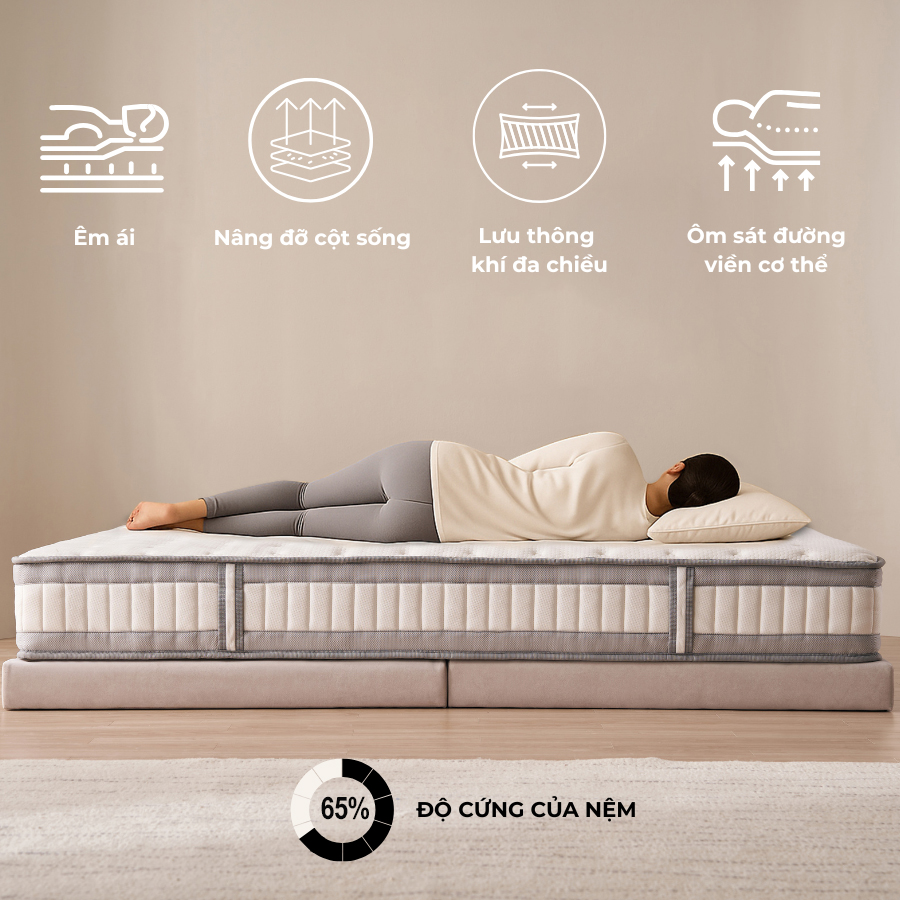 Ngăn tiếng ồn: Mỗi cuộn lò xo được bọc trong một túi vải riêng biệt làm giảm ma sát giữa các cuộn lò xo giúp ngăn tiếng ồn khi hoạt động.